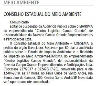 A Audiência Pública que seria realizada no dia 12/04 as 17 horas no Tênis Clube de Santo Andre foi adiada por deliberação do CONSEMA por 60 dias, o órgão acatou pedido protocolado em 29 de março pelo Comugesan (Conselho Municipal de Gestão e Saneamento Ambiental de Santo André).