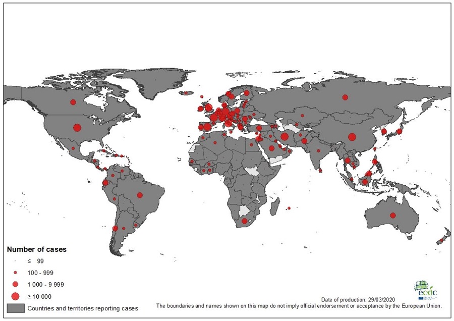 “Desde 31 de dezembro de 2019 e em 29 de março de 2020, foram notificados 657 140 casos de COVID-19 (de acordo com as definições de casos aplicados e estratégias de teste nos países afetados), incluindo 30 451 mortes.