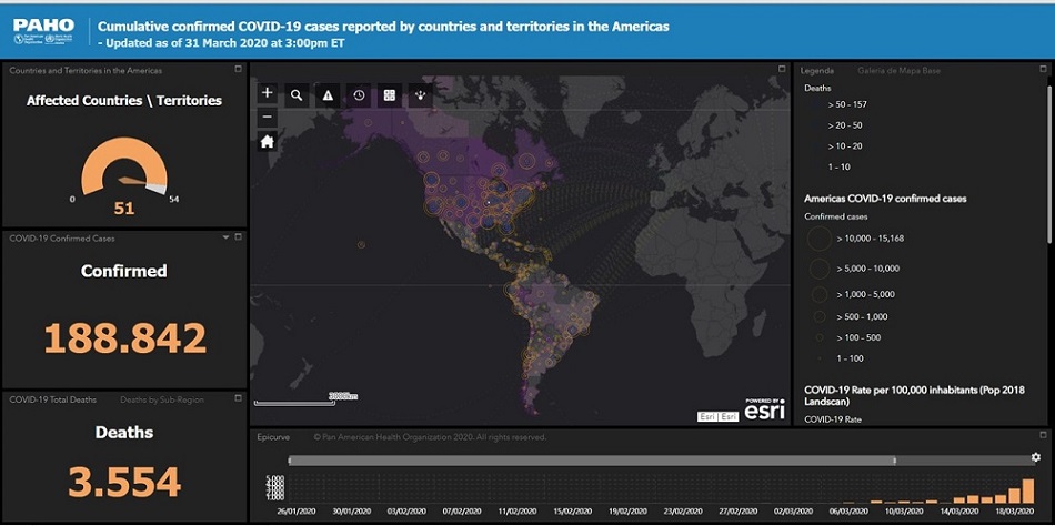 Em 31 de março de 2020, três meses após a notificação do primeiro caso de COVID-19 na China, 188.949 casos confirmados foram registrados nas Américas e 3.561 mortes.