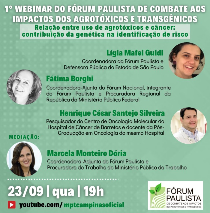 O Fórum Paulista de Combate aos Impactos dos Agrotóxicos e Transgênicos vai promover na próxima semana, no dia 23 de de setembro, seu primeiro webinário. O tema será a “Relação entre uso de agrotóxicos e câncer: contribuição da genética na identificação de risco”.