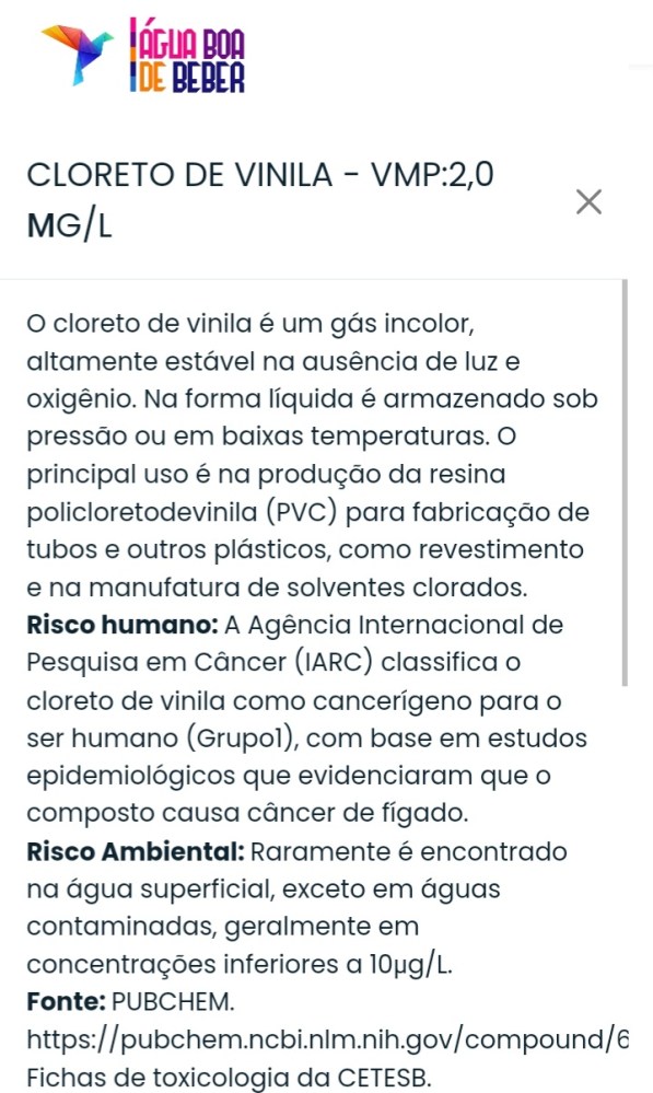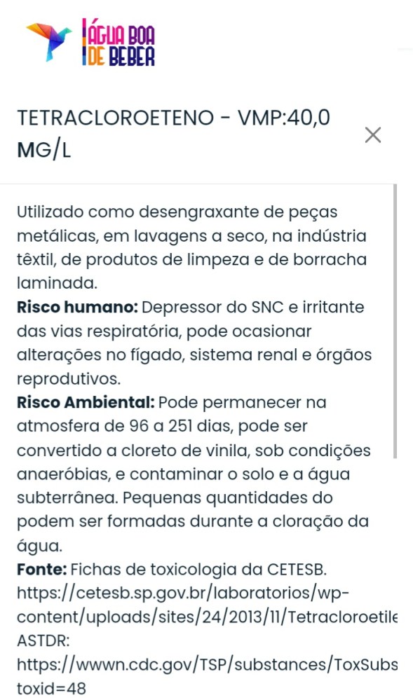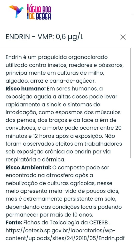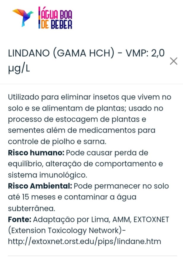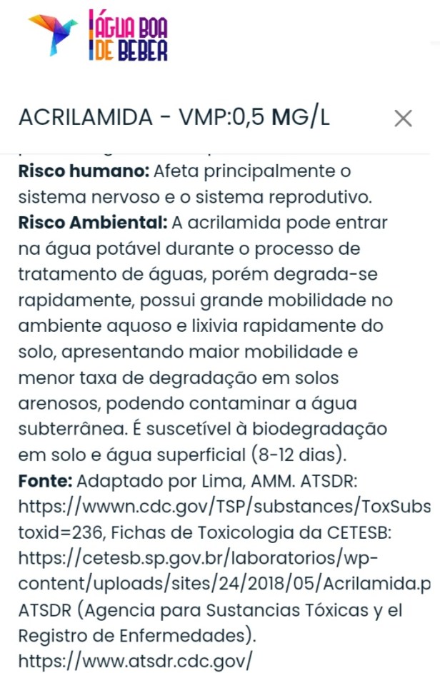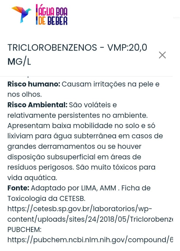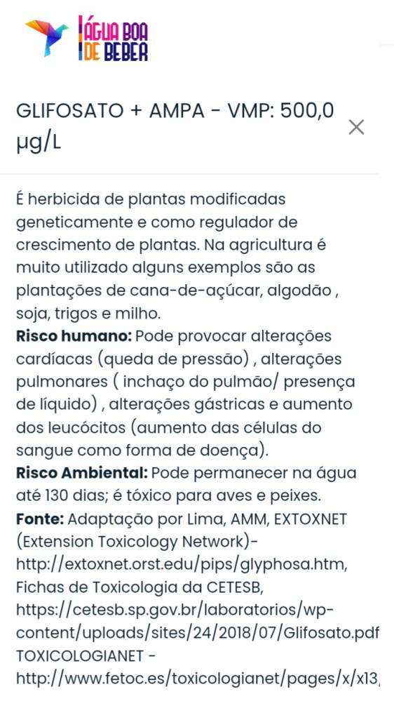 A Ferramenta possui informações de toxicologia , ecotoxicologia pesquisados em plataformas de universidades e livros pela autora deste site e uso dos produtos monitorados pelo Ministério da Saúde e encontrados na água.