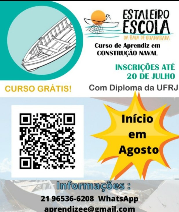 As inscrições para a primeira turma do Curso de Extensão para Aprendizes em Construção Naval Artesanal do Estaleiro Escola da Baía de Guanabara estão abertas para pescadores artesanais dos sete municípios que circundam a Baía de Guanabara, e devem ser feitas até o dia 10 de JULHO através do link: https://forms.gle/pYREhxLrtVfzJHrr9 ; que começa em 21 de agosto.