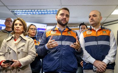 O governador em exercício do Rio Grande do Sul, Gabriel Souza (ao centro), informou, em entrevista coletiva nesta quinta-feira (13), que o estado continua em alerta por causa das fortes chuvas, vendavais e queda de granizo causados pela passagem de um ciclone extratropical no Sul do país. Segundo ele, também são esperadas enchentes na região.