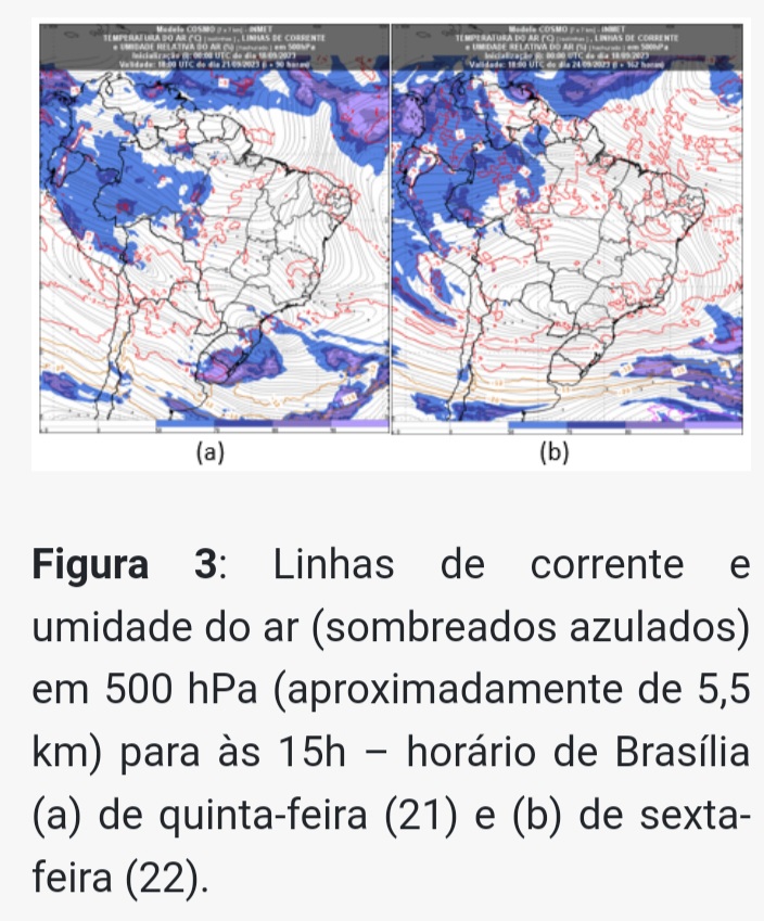 Na figura 3, é possível ver a intensificação do bloqueio atmosférico que ocorre entre quinta-feira e o fim de semana, com o amplo domínio de um centro de alta pressão atmosférica, que impedirá o avanço das frentes frias, além de promover o aquecimento e a diminuição da umidade do ar.