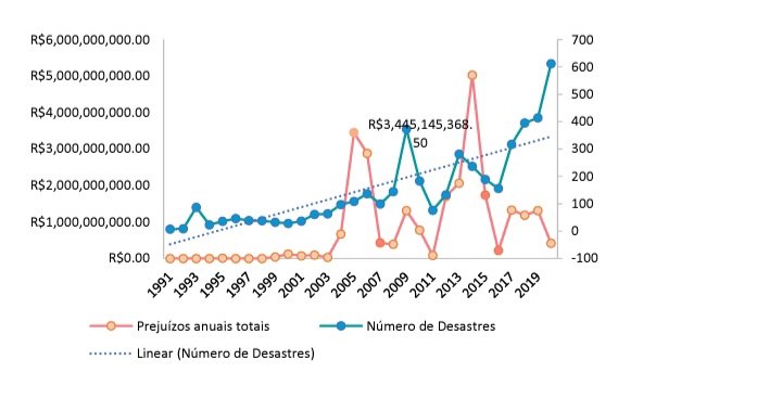 A Figura 4 mostra os valores agregados ano a ano entre 1991 e 2020. Observa-se uma tendência de aumento no número de desastres, sendo que os prejuízos totais tiveram dois picos: um em 2005, quando o valor ficou acima de R$ 3.445 bilhões e um em 2014, excedendo os R$ 5 bilhões de reais. Depois disso, apesar de o número de ocorrências de desastres continuar aumentando, os valores monetários anuais perdidos tiveram uma tendência de queda.