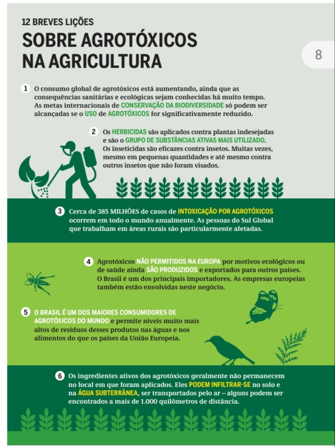 Nas frutas, nos vegetais, no leite materno, no ar e até mesmo nos solos de territórios protegidos – vestígios de agrotóxicos usados na agricultura podem ser encontrados em toda parte. Os agrotóxicos deterioram a saúde humana, a biodiversidade, a água e o solo, mas isso não é, de jeito algum, novidade. Em 1962, por exemplo, tivemos a publicação do livro mundialmente aclamado Primavera Silenciosa, da bióloga Rachel Carson, que descreveu os efeitos nocivos do uso desses produtos. O trabalho foi inovador para o movimento ambiental e levou à proibição de agrotóxicos altamente tóxicos, como o DDT (diclorodifeniltricloroetano). Porém, sessenta anos após o lançamento do livro de Carson, os agrotóxicos estão sendo usados no mundo inteiro em quantidades cada vez maiores, mesmo com regulamentações de aprovação mais rígidas – e acordos voluntários e obrigatórios sobre o manuseio desses produtos. O cultivo de plantas geneticamente modificadas como a soja, criadas pelas mesmas corporações que estão produzindo agrotóxicos, tem contribuído para o aumento do uso de herbicidas, principalmente em países ricos em biodiversidade. O mercado global de agrotóxicos é altamente lucrativo. Algumas empresas agroquímicas influentes estão expandindo seu controle sobre o mercado e prosperando com lucros cada vez maiores. Na vanguarda: empresas europeias como Bayer e BASF. A União Europeia (UE) é o maior mercado de exportação de agrotóxicos do mundo, e vem investindo cada vez mais em países do Sul Global. As empresas da região exportam agrotóxicos que são proibidos em seus próprios territórios, devido aos seus efeitos nocivos na saúde humana e no meio ambiente. 6 “ A União Europeia é o maior mercado de exportação de agrotóxicos do mundo, e vem investindo cada vez mais em países do Sul Global. ” O Brasil é um dos países mais importantes para esse mercado, ocupando o pódio dos maiores consumidores e importadores de agrotóxicos. O país permite limites de resíduos em água e alimentos muito superiores aos da UE. Isto possibilita o registro cada vez maior de novos agrotóxicos, com recordes sendo batidos a cada ano, além do crescimento da importância das commodities na economia brasileira, a partir da ampliação da área plantada e da produção de culturas mais dependentes desses produtos. Este processo gera uma série de problemas nacionais relativos ao uso de agrotóxicos, que por sua vez são sui generis, como o crescimento dos registros de conflitos no campo envolvendo a contaminação de comunidades da agricultura familiar ou de povos tradicionais. Em contrapartida ao consumo cada vez maior desses produtos, multiplicam-se também os movimentos sociais e organizações da sociedade civil que pesquisam e denunciam os impactos dos agrotóxicos, para combater o seu avanço e apresentar alternativas a este modelo, como a agroecologia. Pesquisas recentes indicam um aumento no consumo de alimentos orgânicos entre brasileiros durante os últimos anos, o que mostra que as pessoas estão cada vez mais conscientes em relação à importância do acesso aos alimentos cultivados sem o uso de agrotóxicos. O debate sobre os riscos do consumo de agrotóxicos não cresce apenas em solo brasileiro.O debate sobre os riscos do consumo de agrotóxicos não cresce apenas em solo brasileiro. O tema tem visibilidade mundial, a partir do avanço de graves impactos.